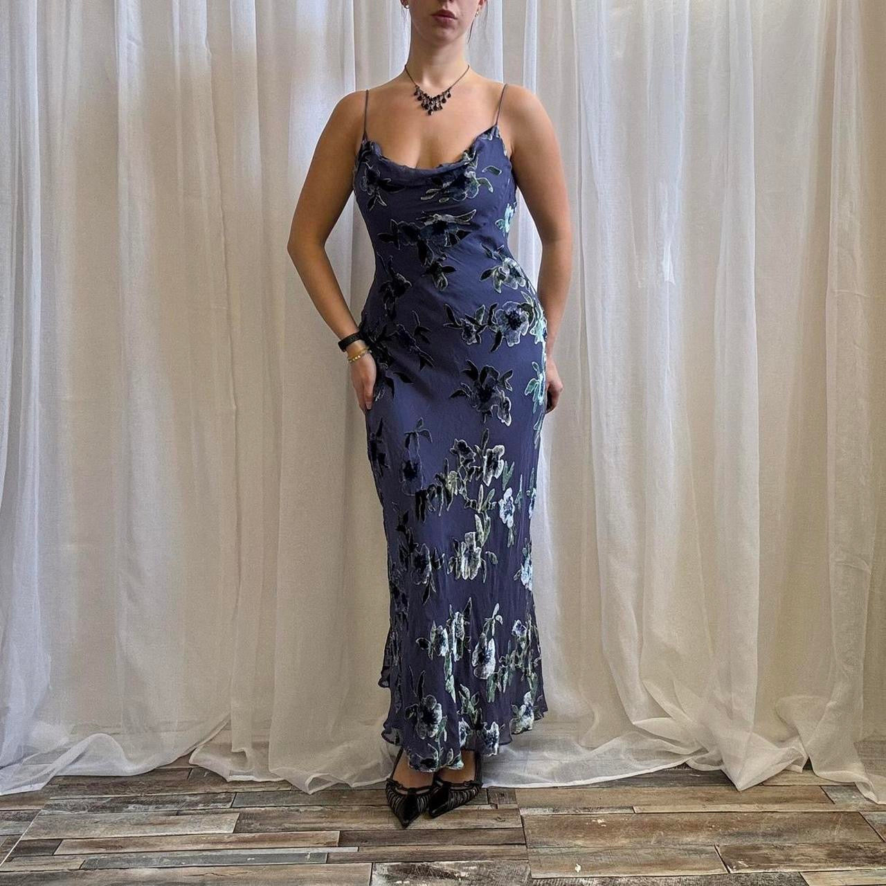 whimsical y2k Monsoon silk blend maxi dress blue floral velvet devore