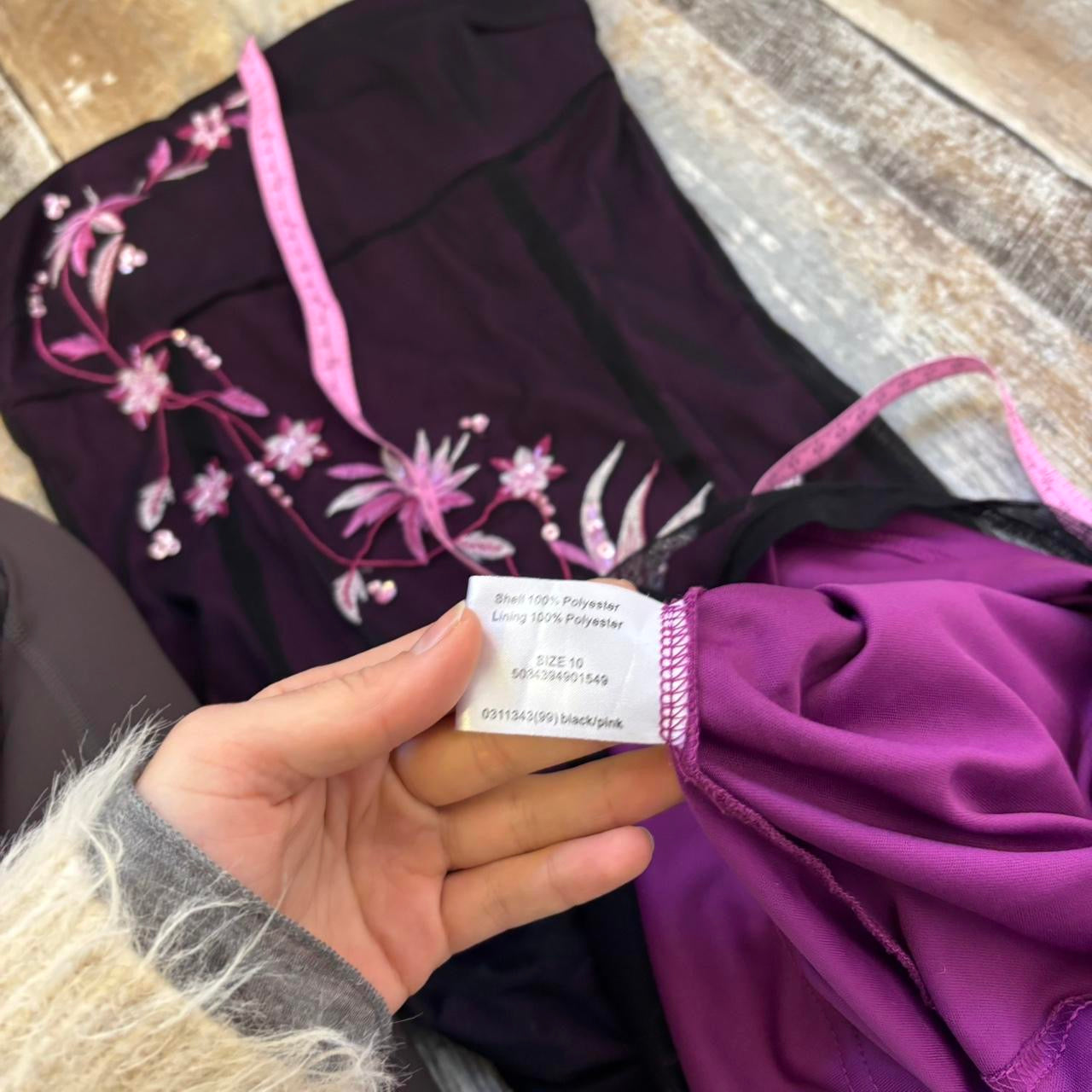 beautiful dress, stretchy material, floral embroidery across the front and back