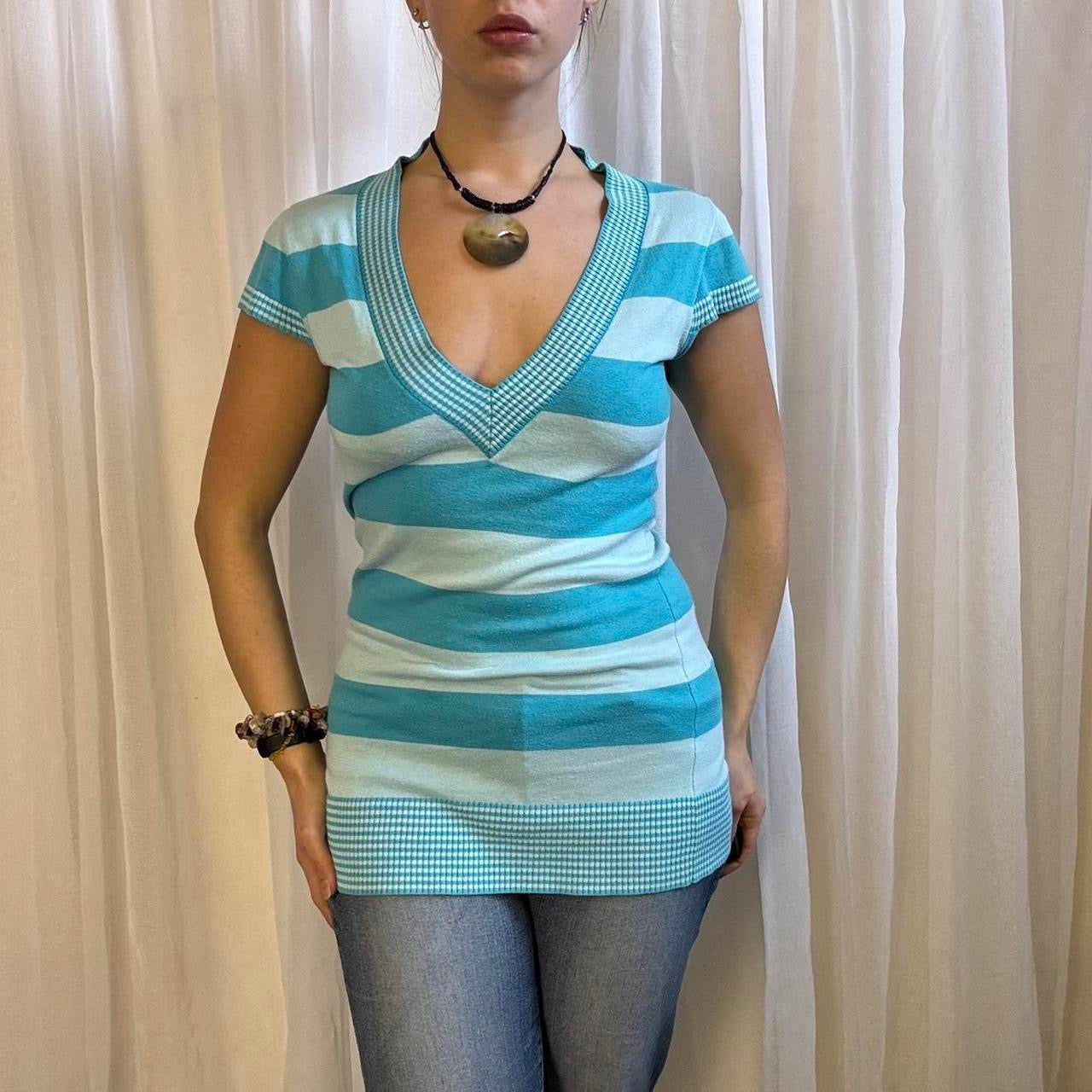 y2k Jane Norman short sleeve longline jumper blue striped v neck