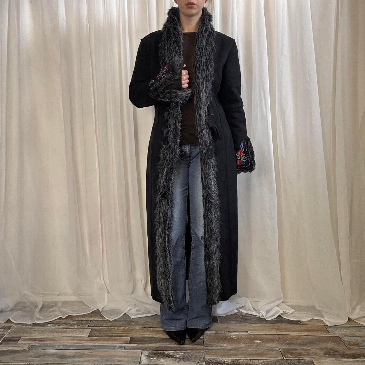 super warm and cosy coat, buckle closure down the middle with a faux fur trim collar and trim, floral embroidery on the sleeves